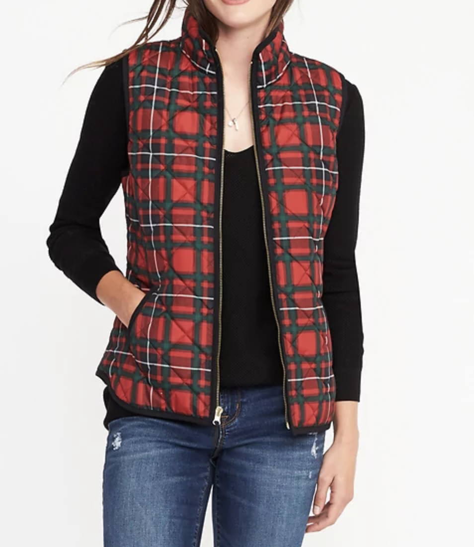 SALE ALERT // As of 11/6/2017, the Old Navy tartan quilted vest is on sale for $15.00. Click here to check it out: Old Navy Quilted Vest Also, the quilted vest from J.Crew Factory is over 40% off. Check it out here: J.Crew Factory Quilted Vest